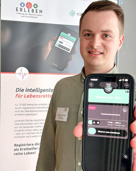 „ERLEBEN – Erhöhung der Überlebensraten nach Herzstillstand“ ist durch das Land Niedersachsen gefördert. Im Einsatz ist die Ersthelfer-App „Corhelper“. Die App koordiniert ortsnah die Entsendung von qualifizierten Ersthelfenden zur Wiederbelebung an den Einsatzort. Denn: Bei einem Herzstillstand zählt jede Sekunde. Der Notruf 112 setzt dabei die Rettungskette in Gang.